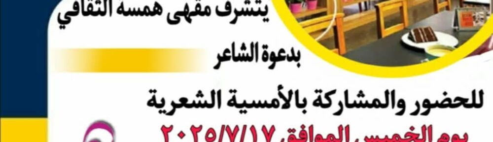 دعوة عامة لحضور امسية همسة الادبية يوم الخميس القادم ١٨ يوليو ٢٠٢٥ بمقر دار همسة للنشر والتوزيع الثامنة مساء