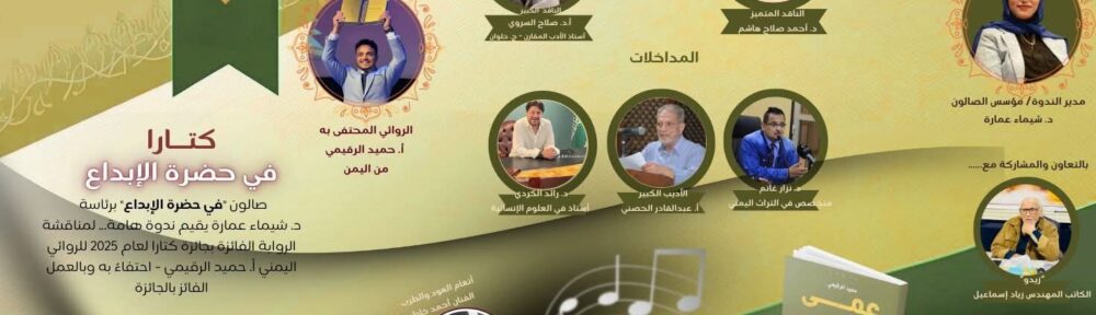 يدعوكم صالون «في حضرة الإبداع» برئاسة د. شيماء عمارة .. إلى ندوة ثقافية خاصة للاحتفاء بالرواية الفائزة 🎉🎉بجائزة كتارا 🎉🎉للرواية العربية 2025